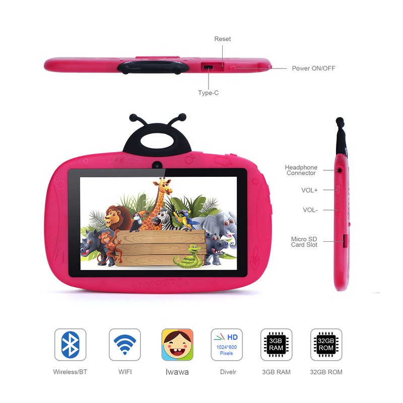 Dispõe de um ecrã IPS1024*600 HD premium. Display brilhante, cores vivas e ajuste automático de brilho da tela proporcionam uma experiência visual perfeita para crianças,que pode proteger melhor os olhos em comparação com outras marcas de ecrã de tablet.
